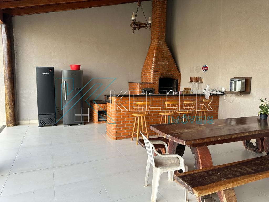 Possui cozinha gourmet com churrasqueira, forno e fogão a lenha